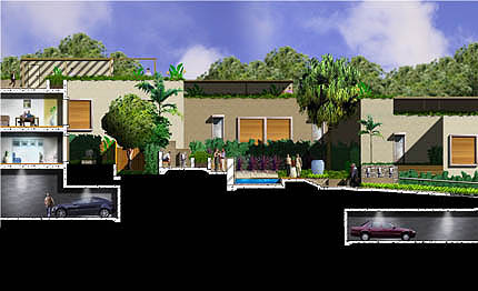 Sectional elevation detailing carparking, underground water tanks & entry area water feature detail. |