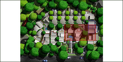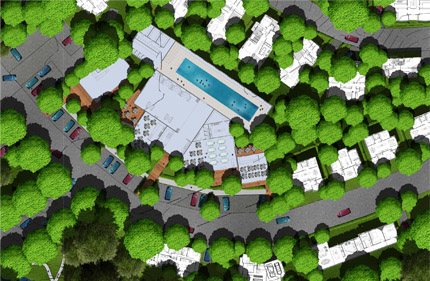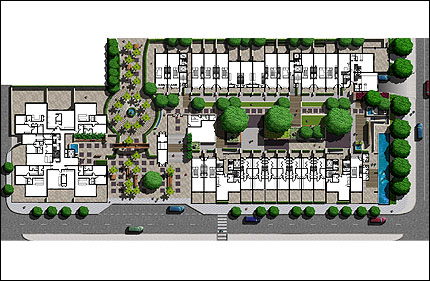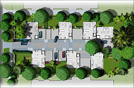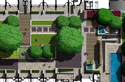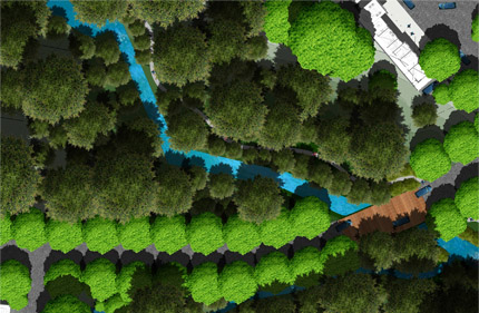 Streetscape treatment showing existing trees supplemented with new trees. |